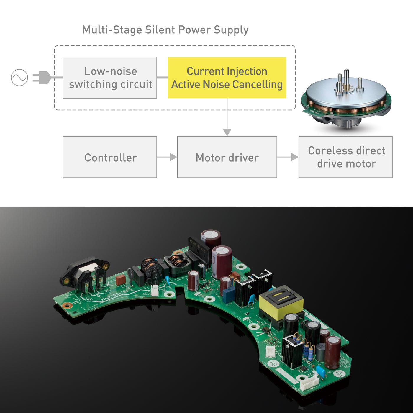 Use of a high-speed switching power supply ensures a stable supply capacity and less ripple and humming. Applying a switching power supply to a turntable eliminates the need for a large transformer and countermeasures for the ensuing mechanical vibrations. A switching frequency of above 100 kHz limits the impact of noise on the music playback bandwidth.