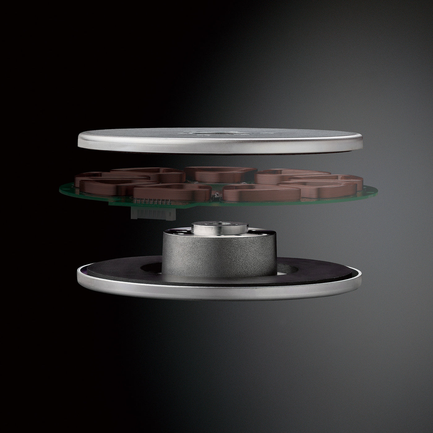 In the SL-1300G, the use of a coreless direct-drive motor with no iron core eliminates uneven rotation of the turntable known as cogging. Also, the twin-rotor construction reduces the bearing load while maintaining high torque, and reduces minute vibrations during rotation. Furthermore, the SL 1300G’s motor was redesigned to eliminate subtle vibrations that could affect sound quality. To improve rigidity, the same reinforcement pattern as the Reference Class SL-1000R/SP 10R was used for the coil mounting base.